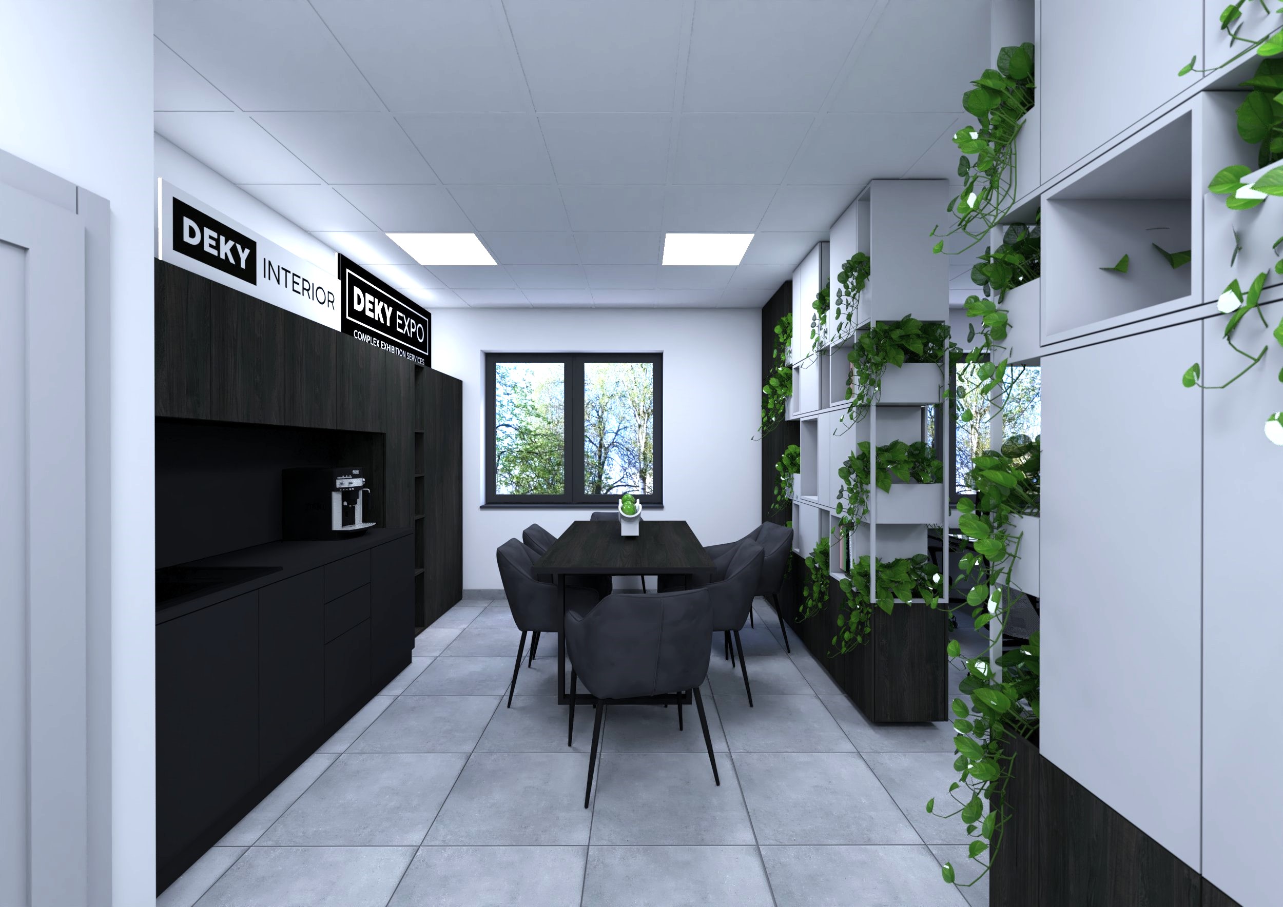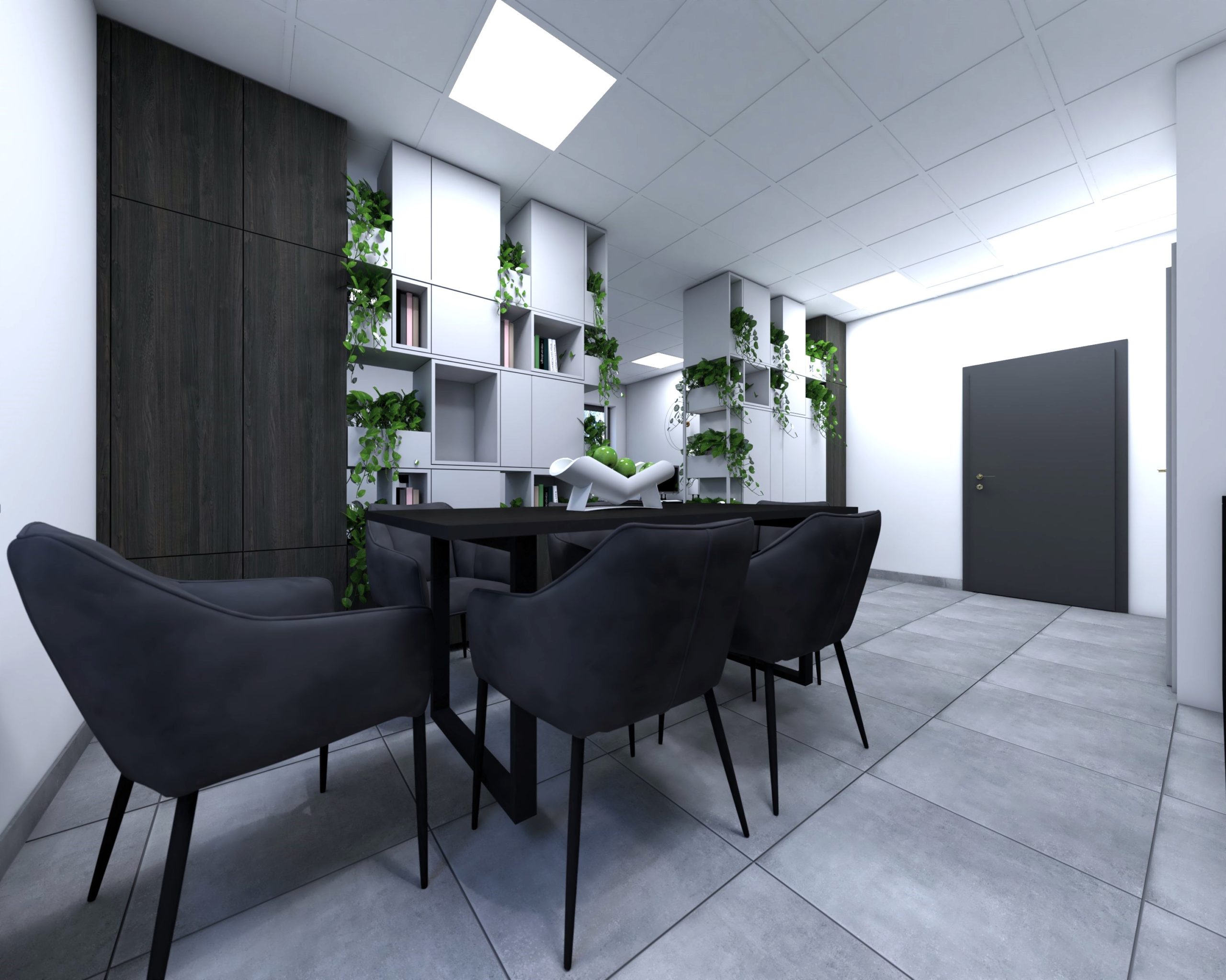 Kompleksowy projekt wnętrz powierzchni biurowej w systemie open space office. Podział otwartej przestrzeni za pomocą mobilnej zabudowy meblowej pozwala na stworzenie układu funkcjonalnego bez stawiania typowych ścian działowych. Zaprojektowana zabudowa meblowa, po za praktycznym zastosowaniem jest formą dekoracji, geometryczna instalacja z zastosowaniem naturalnych roślin, które są bardzo cenione w miejscu pracy.