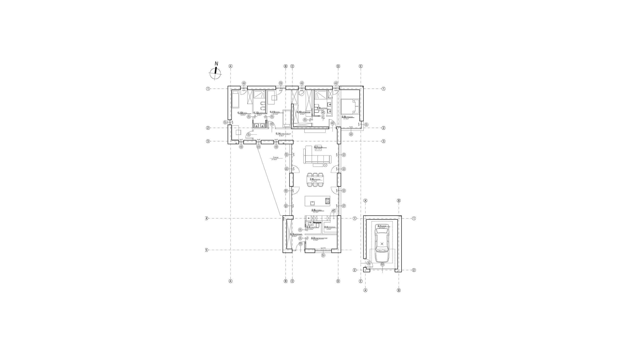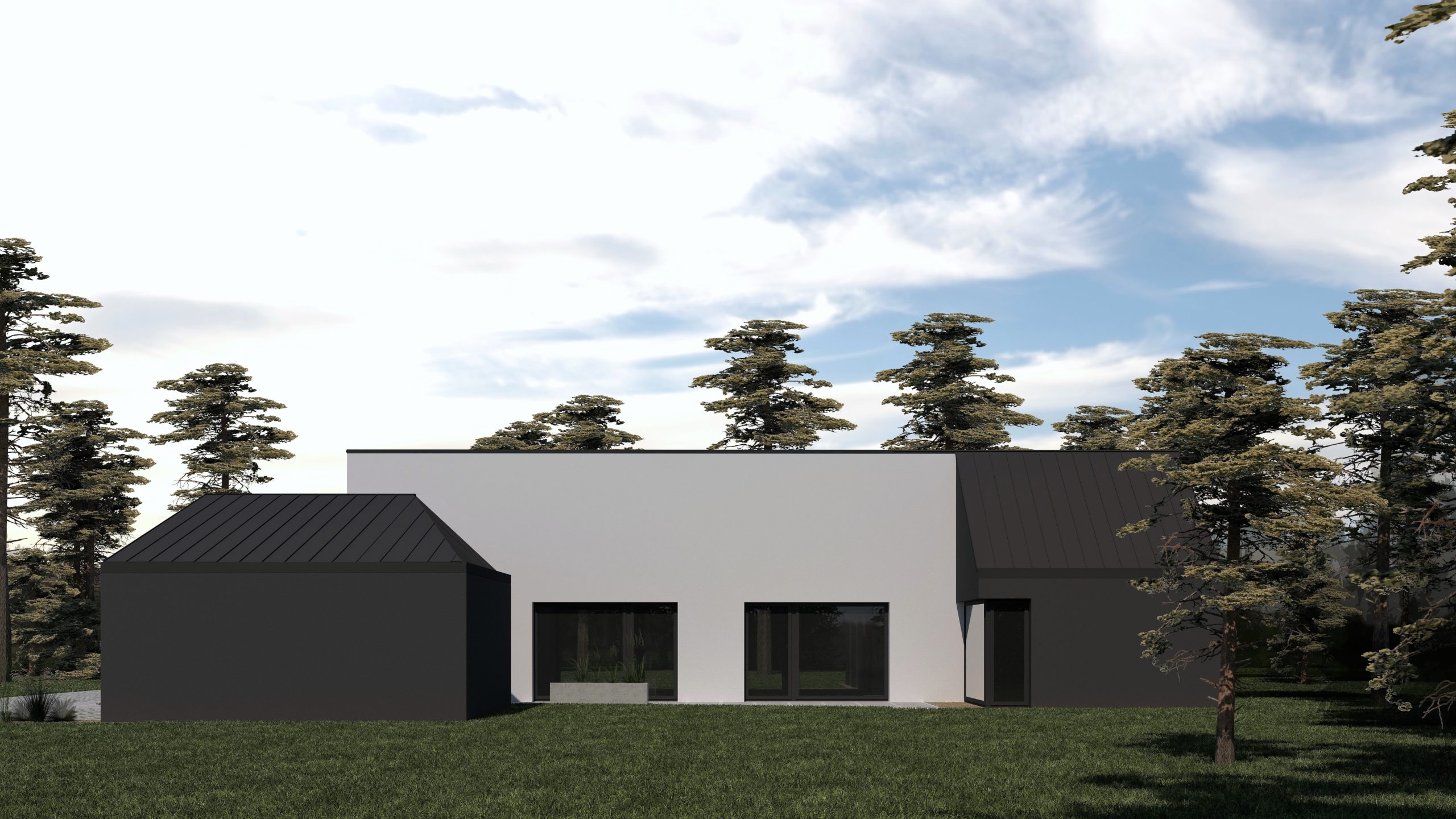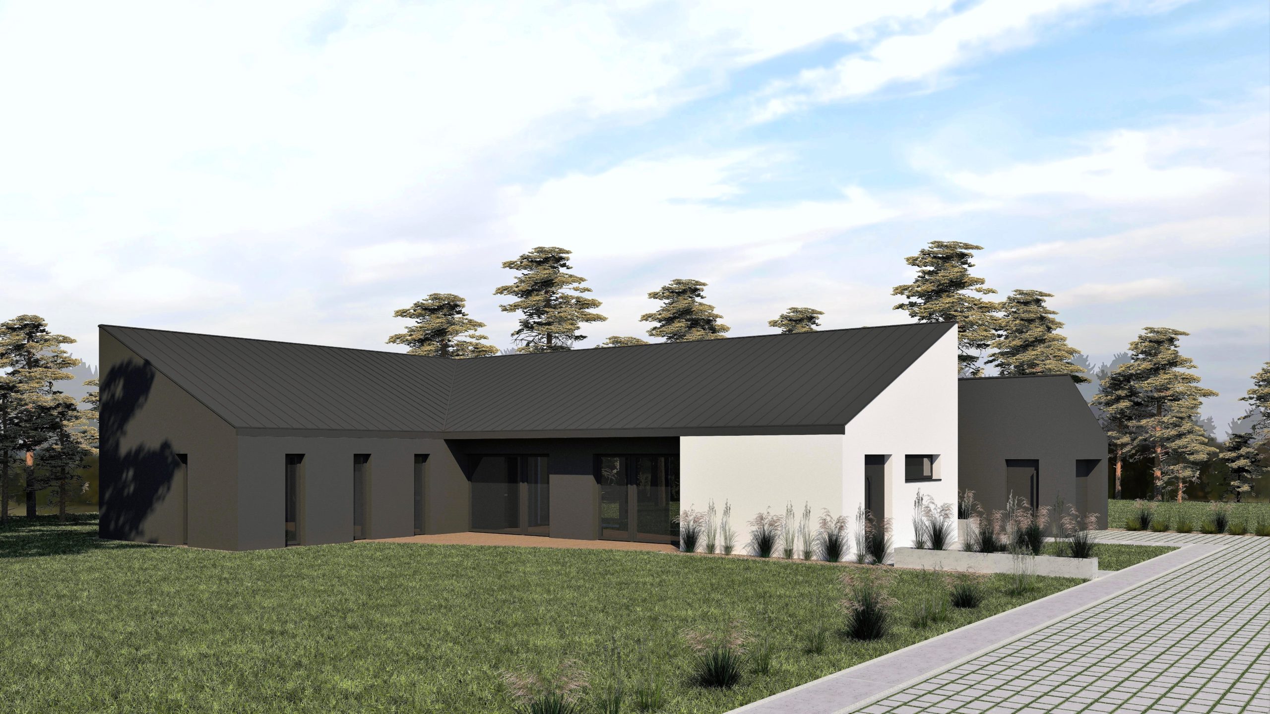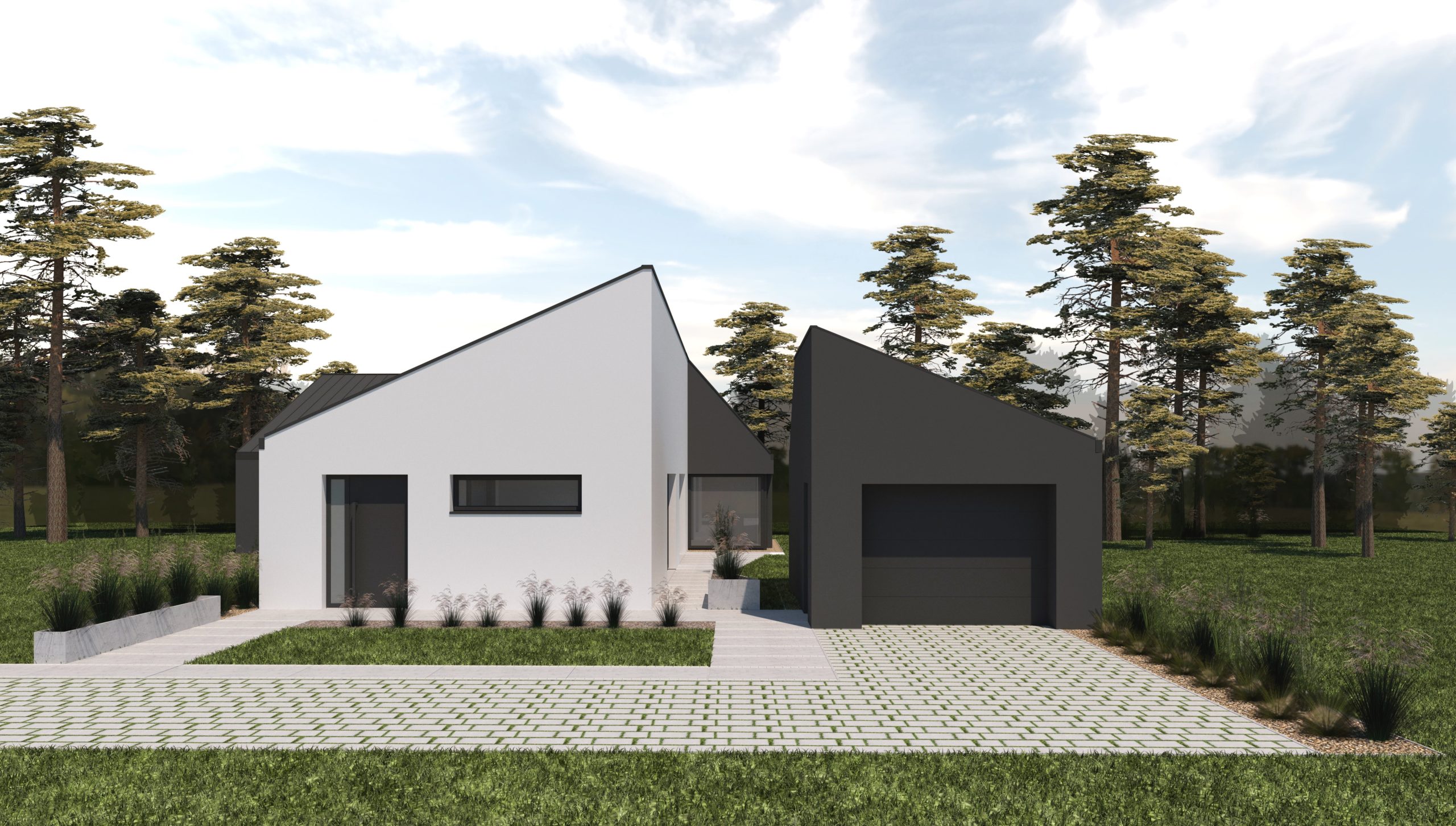 Nowoczesna forma komfortowego domu jednorodzinnego dla czteroosobowej rodziny. Podział strefy dziennej – ogólnodostępnej i nocnej – prywatnej widoczny jest nie tylko w rzucie układu funkcjonalnego, ale również w bryle budynku. Minimalistyczna bryła z dachem pulpitowym to połączenie dwóch form, grafitowej – strefa prywatna i białej – strefa ogólnodostępna. Garaż zaprojektowano jako niezależny, wolnostojący budynek.